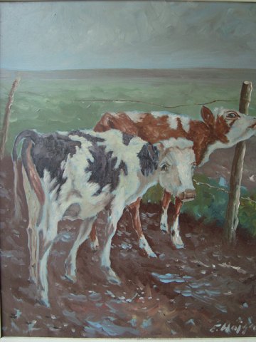 Erik Højgaard (20 årh): "Kvier" Olie på plade. Sign.: E. Højgaard. 33x41 (52x46) Maleriet kan evt. også være af kunstneren Erling Højgaard (1891-1959), der var Charlottenborgudstiller.