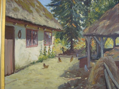 Gustav P. Rimmer (1904-88): Gårdeksteriør med høns på gårdplads. Olie på lærred. Sign.: G.P. Rimmer 40x50 (51x61)