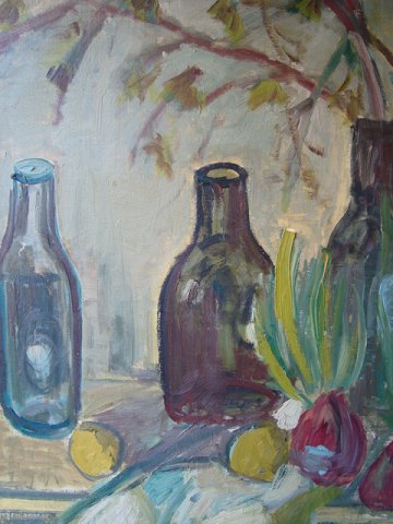 Opstilling på karm med flasker, blomsterløg og frugt - 1973.