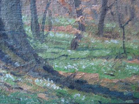Ubekendt kunstner (20 årh): Forårs skovbund med anemoner. Olie på lærred. Sign.: Junker 34x50 (42x58) Virkeligt dejligt maleri i skønne farver.