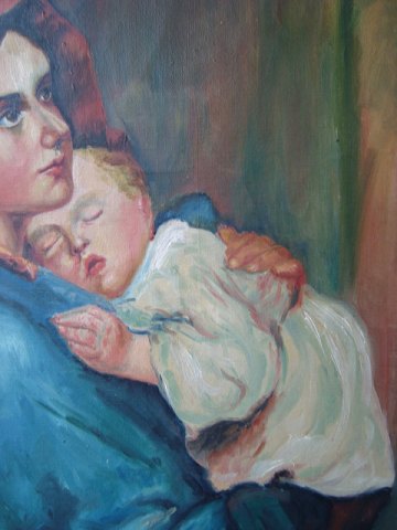 Ubekendt kunstner (20 årh): Madonnina - Gadernes Madonna 1923. Efter maleri af Roberto Ferruzzi fra 1897. Olie på lærred. Sign.: Mészáros .... 1923 68x50 (76x58)