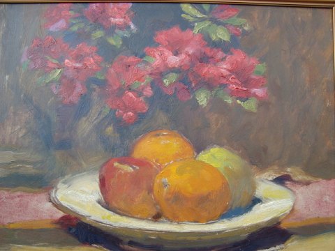 Opstilling på bord med frugtfad og blomster.