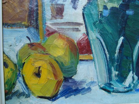 Erik Mortensen (1902-77): Opstilling med blomster i vase og æbler på bord 1971. Olie på lærred. Sign.: EM - 71. 51x39 (58x47)