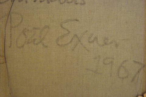 Poul Exner (født 1929): "Jesus i Emmaus" - 1967. Olie på lærred. Sign.: P. Ex - 67. Bagpå betegnet - Emmaus. Bagpå signeret - Poul Exner 1967. 66x56 (77x67)
