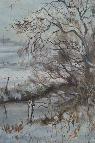 Thorvald Jørgensen (født 1909): Vinterparti med å. Olie på lærred. Sign.: Thv. J. 47x57 (59x69)