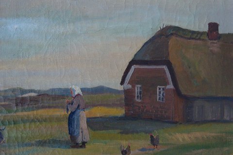 Kone og køer foran klitgård - antagelig ved Søndervig.