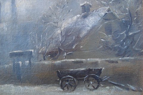 Aftenstemning fra sneklædt by med skomager og fabrikker i baggrunden.