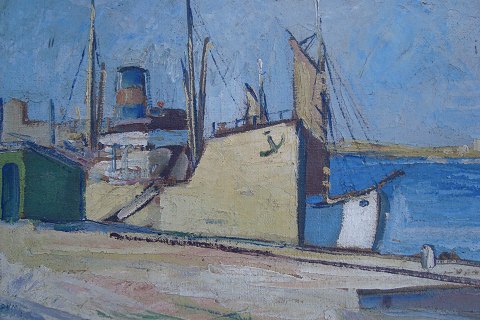 Børge Ibsen (1913-2002): Havneparti. Olie på lærred. Sign.: B. Ibsen 50x62 (57x70)