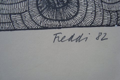 Ubekendt kunstner (20 årh): Kompsition med svampe. Træsnit på papir 1982. Sign.: Freddi - 82. (Én for mig ubekendt kunstner). Nummer - 91/100. Indrammet i aluramme (30x40)