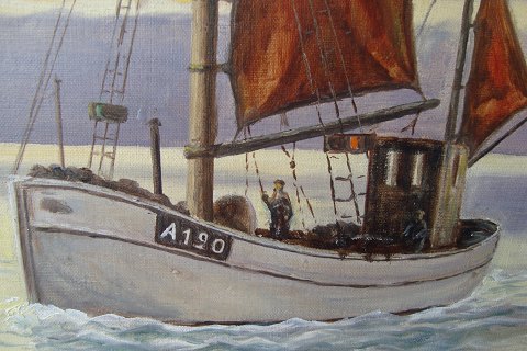 Ubekendt kunstner (20 årh): Fiskekutter A120 ved solopgang 1966. Olie på lærred. Sign.: Gotfred R: 66. 50x40 (63x53)