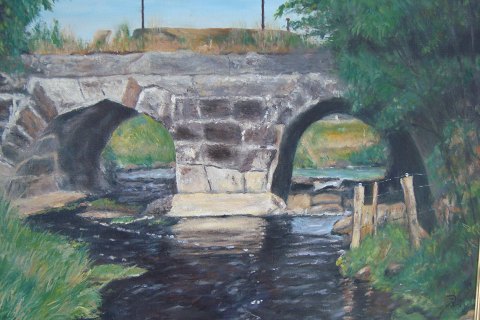 Ubekendt kunstner (20 årh): Gejlå Bro ved Bommerlund Plantage. Olie på lærred. Sign.: Monogram JR 52x68 (63x78) Et virkeligt dejligt og spændende maleri af, en af mig, ubekendt kunstner.