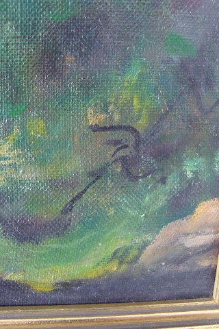 Ubekendt kunstner (20 årh): Gejlå Bro ved Bommerlund Plantage. Olie på lærred. Sign.: Monogram JR 52x68 (63x78) Et virkeligt dejligt og spændende maleri af, en af mig, ubekendt kunstner.