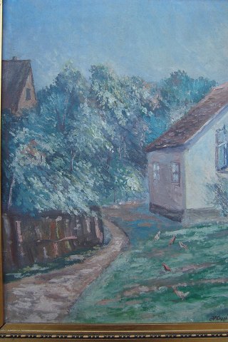 Hjalmar Kragh Pedersen (1883-1962): Eksteriør med hus og gårdsplads med høns. Olie på lærred. Sign.: H. Kragh Pedersen 51x40 (65x54) Kragh Petersen var uddannet fra Teknisk Skole i København 1897-98.