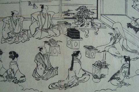 Ubekendt japansk kunstner (19 årh): Selskab med talrige personer. Træsnit på papir. Enkelte mærker efter tape. Inrammet med passepartuot i ny "guld" metalramme. 17x25 (28x36)