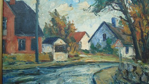 Finn Andersen (1909-87): Landsbyparti med iskiosk og vejskilt. Olie på lærred. Sign.: Finn An. 57x66 (66x75) Finn Andersen var uddannet fra Teknisk Skole og derefter gik han på skole hos Bizzie Høyer.