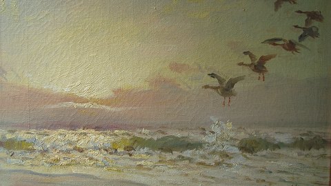 Mark Osman Curtis (1879-1959): Flyvende gæs over brænding på standen ved Skagen. Olie på lærred. Sign.: Koefod-Hansen (Pseudonym). Betegnet - Skagen. 30x40 (42x52)