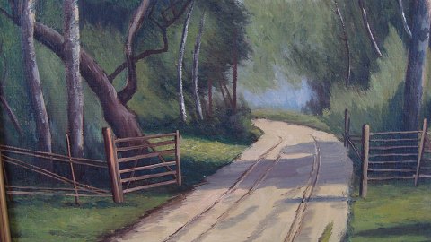 Niels Anders Henningsen (1903-77): Vej gennem skov og gærde. Olie på lærred. Sign.: N. Henningsen.