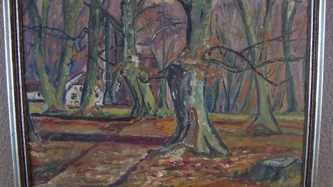 Ubekendt kunstner (20 årh): Hus i skov, efterår. Olie på lærred. Sign.: Solveig ?? 46x60 (52x66)