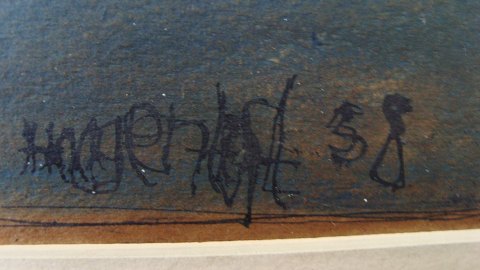 Ubekendt kunstner (20 årh): Hus i blå skumring 1958. Pastel mv på papir. Sign.: Utydelig signeret (en for mig ubekendt signatur)1958. Indrammet uden glas. Spændende billede. 43x55 (60x72)