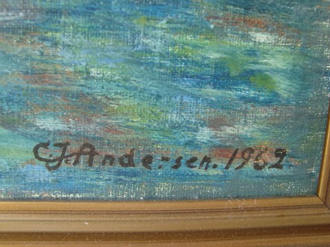 C.J. Andersen (20 årh): Havneparti med gule lagerbygninger 1962 - Frederikshavn? Olie på lærred. Sign.: C.J. Andersen 1962. 33x44 (37x48)
