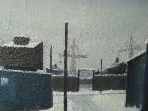 C.J. Andersen (20 årh): Vinterparti med fabriksbygninger 1970. Olie på lærred. Sign.: C.J.A. 70. 32x41 (39x48)