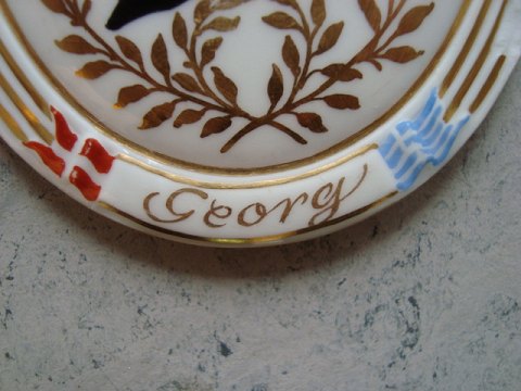 Oval plakette med forgyldt fane og forgyldt gennembrudt græsk kongekrone, samt Dannebrog og det græske flag. Den sorte silhuet laurbærkranser med guld.