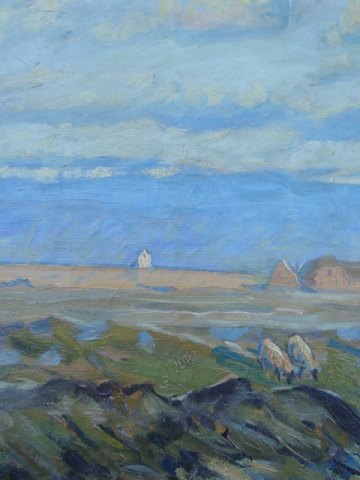 Jakob Hübschmann (1894-1974): Marsklandskan med marskgård og græssende får samt by i baggrunden med kirke. Olie på lærred - nyrenset. Sign.: J. Hübschm. Indrammet i Varde. 46x74 (54x81)