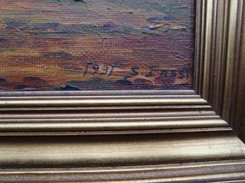 Sergius Frost (1900-94): Fårehyrde på vej mod hus på heden 1931. Olie på lærred. Sign.: S. Frost 1931 Bagpå - Sergius Frost samt monogramsignatur 19 SF 31. 25x33 (35x42)