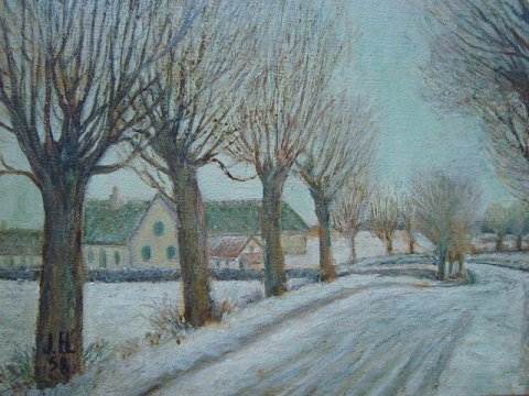 Jo Hahn Locher (1876-1960): Vinterparti med allé op til ejendom 1958. Olie på lærred. Sign.: J.HL. 58. 22x31 (32x41)