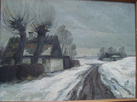 Jens Sinding Christensen (1888-1980): Vej med gårde og stynede popler, vinter. Olie på lærred. Sign.: JSC (Monogram) 30x40 (39x49)