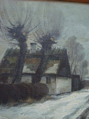 Jens Sinding Christensen (1888-1980): Vej med gårde og stynede popler, vinter. Olie på lærred. Sign.: JSC (Monogram) 30x40 (39x49)