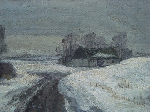 Jens Sinding Christensen (1888-1980): Vej med gårde og stynede popler, vinter. Olie på lærred. Sign.: JSC (Monogram) 30x40 (39x49)
