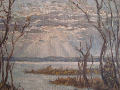 A. Hillertz (20 årh): Søparti med ænder og solen der bryder igennem. Olie på lærred. Sign.: A. Hillertz 29x36 (34x40)