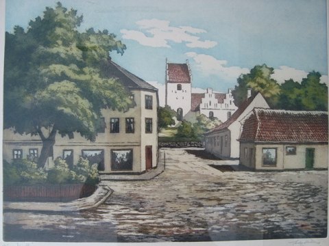 Peder Møller (1890-1961): Parti fra Nørresundby med kirken i baggrunden. Farveradering på papir. Betegnet - Nørre Sundby Sign.: Peder Møller 51x59 (58x67)