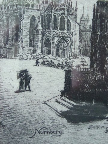 Max Bilitz (19/20 årh): Schöner Brunnen i Nürnberg. Radering på papir. Sign.: MBz i trykket samt signeret med bly M. Bilitz. Betegnet - Schöner Brunnen, Nürnberg. 14x9 (21x16) 811