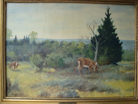 G. Jans (20 årh): Spisende råvildt ved bevoksning. Olie på lærred. Nyrenset. Sign.: G. Jans Messingskilt - G. Jans. Indrammet i meget smuk ældre ramme. 32x44 (48x60)