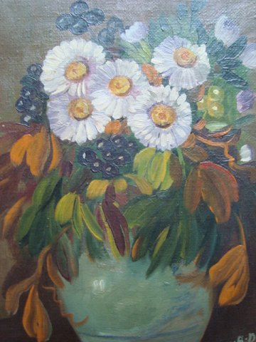 Ingeborg Bentine Debois (1897-1970): Krukke med blomster og bær. Olie på lærred. Sign..: I.B. Debois 32x23 (38x30)
