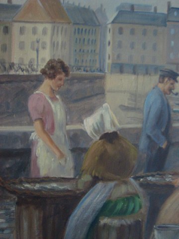 Sigurd Schou (1875-1944): Fiskerkoner og kunder ved Gammel Strand i København. Olie på lærred. Ny guldramme og ny blindramme. Sign.: S. Schou 62x53 (72x63)