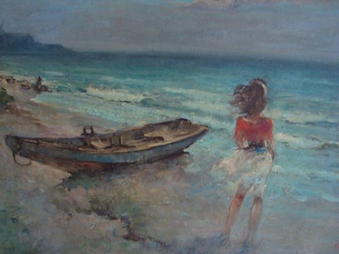 Ejnar Ploug (1914-83): Pige der kigger ud over vandet i blæsevejr. Olie på lærred. Sign.: Ploug 41x51 (52x62) Ejnar Ploug var uddannet fra Kunstakademiet i Stockholm.