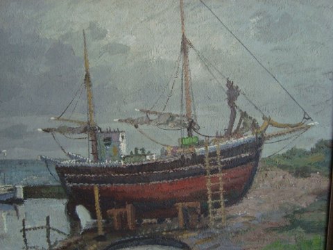 Jens Sinding Christensen (1888-1980): Fiskehuttere i havn. Olie på lærred. Sign.: Monogram JSC Bagpå lærred - No. 1685 38x49 (48x60)