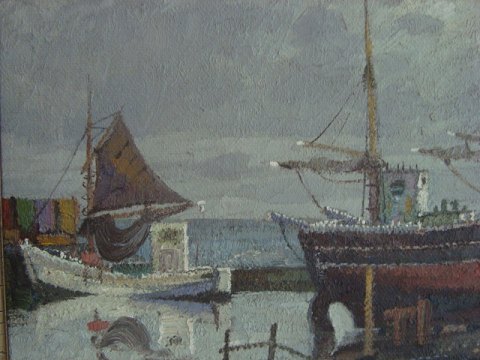 Jens Sinding Christensen (1888-1980): Fiskehuttere i havn. Olie på lærred. Sign.: Monogram JSC Bagpå lærred - No. 1685 38x49 (48x60)