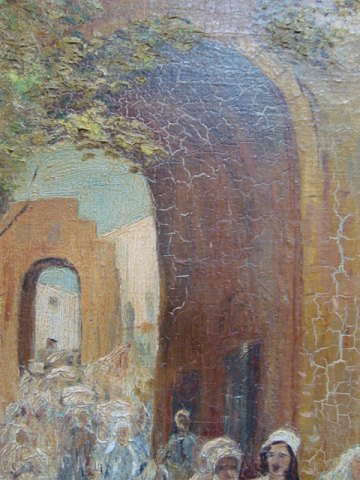 Ubekendt kunstner (20 årh): Folkemængde i Jerusalem. Olie på lærred. Utydelig sign.: Cryri.. Zerok....??? Krakeleret. Betegnet på bagsiden - Jerusalem 45x35 (56x46)