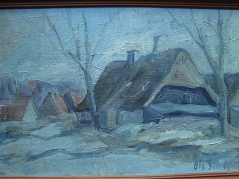 Ole Sværdpiil (1914-80): Vinterlandskab med huse. Olie på plade. Sign.: Ole Sværdpiil. 35x54 (39x58)