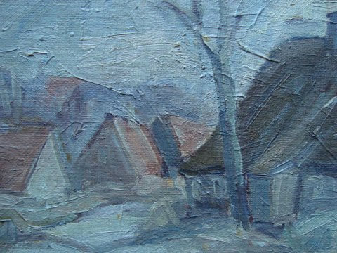 Ole Sværdpiil (1914-80): Vinterlandskab med huse. Olie på plade. Sign.: Ole Sværdpiil. 35x54 (39x58)