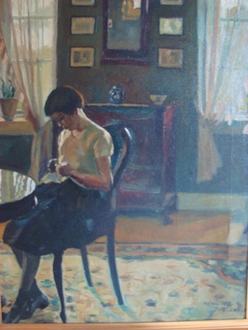 Henning Jørgensen (1893-1944): Interiør med syende kvinde. Olie på lærred. Sign.: Henning Jørgensen 61x47 (73x59)