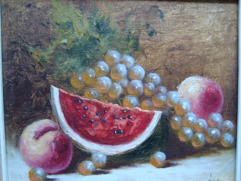 K. Kovacs (20 årh): Opstilling med vandmelon, ferskner og vindruer. Olie på plade. Sign.: K. Kovacs 25x30 (34x39)
