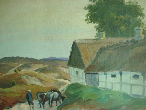 W. Winkelmann (20 årh): Landskab med vej forbi gård 1932. Olie på lærred. Sign.: W. Winkelmann 32. Bule og lille brist på lærredet øverst. 70x90 (81x101)