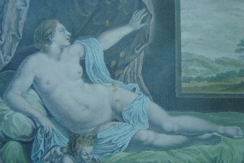 Noël Le Mire (1724-1801): Jupiter & Danaé. Koloreret kobberstik på papir. Peint par Annibak Carracci - Gravé per N. le Mire. 19x23 (26x30)