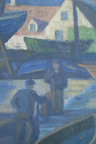 Havneparti med arbejdende fiskere ved deres både.