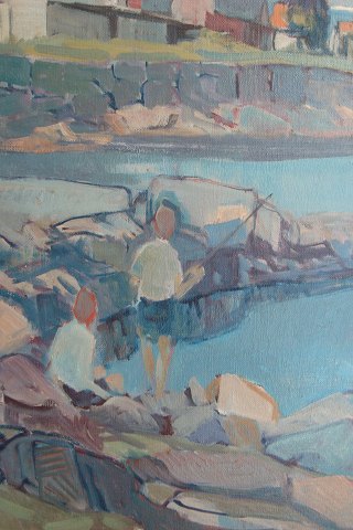 Nis Stougaard (1906-87): Kystparti fra Bornholm med fiskende børn og røgerier. Olie på lærred. Sign.: Nis Stougaard Messingplade - N. Stougaard. 50x40 (60x50)